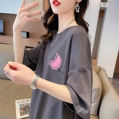 可愛いピンク月柄 刺入り Tシャツ 丸襟 半袖<ins-2832>