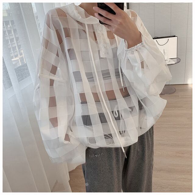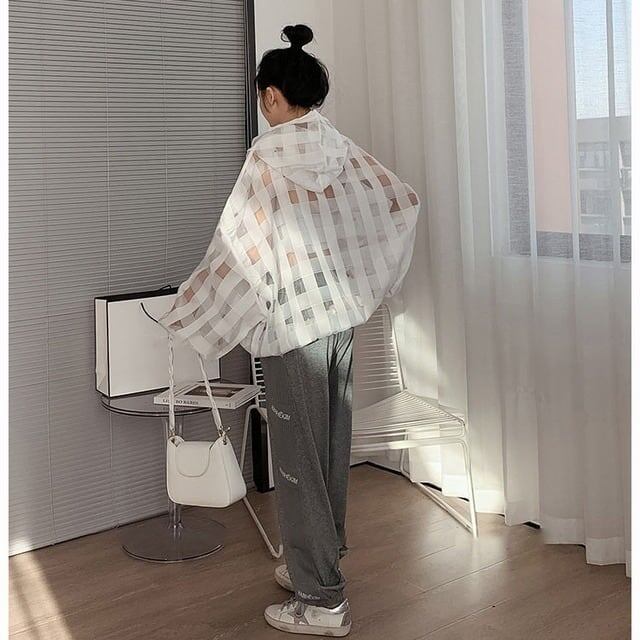 カジュアル 透け感 日焼け対策 チェック柄 ジャケット ブルゾン<ins-2958>