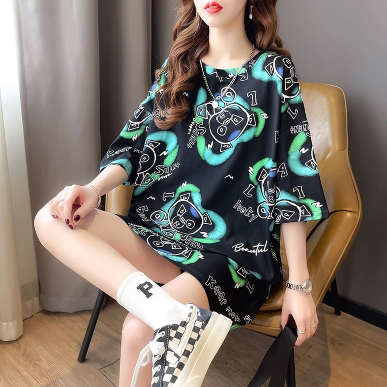 好感度満載 美感いっぱい プリント Tシャツ カットソー ワンピース<ins-3501>