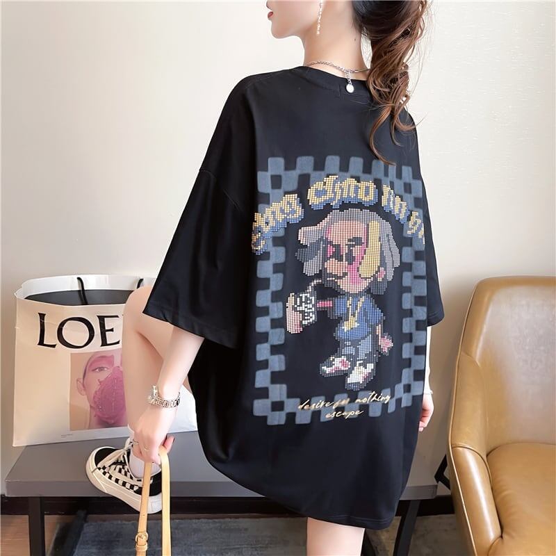 ゆったり感アップ オシャレ度満点 切り替え プリント Tシャツ カットソー<ins-3478>