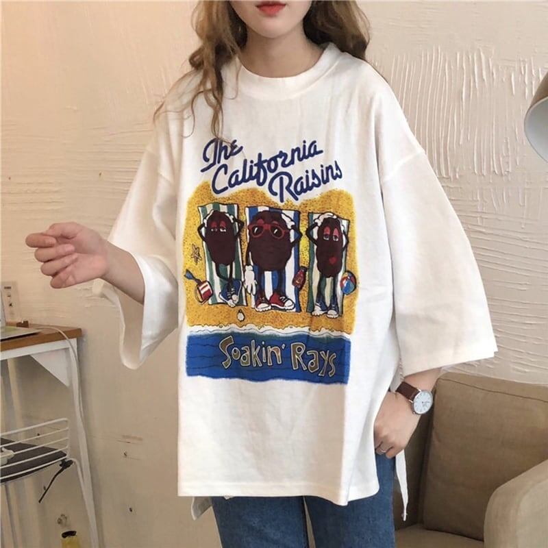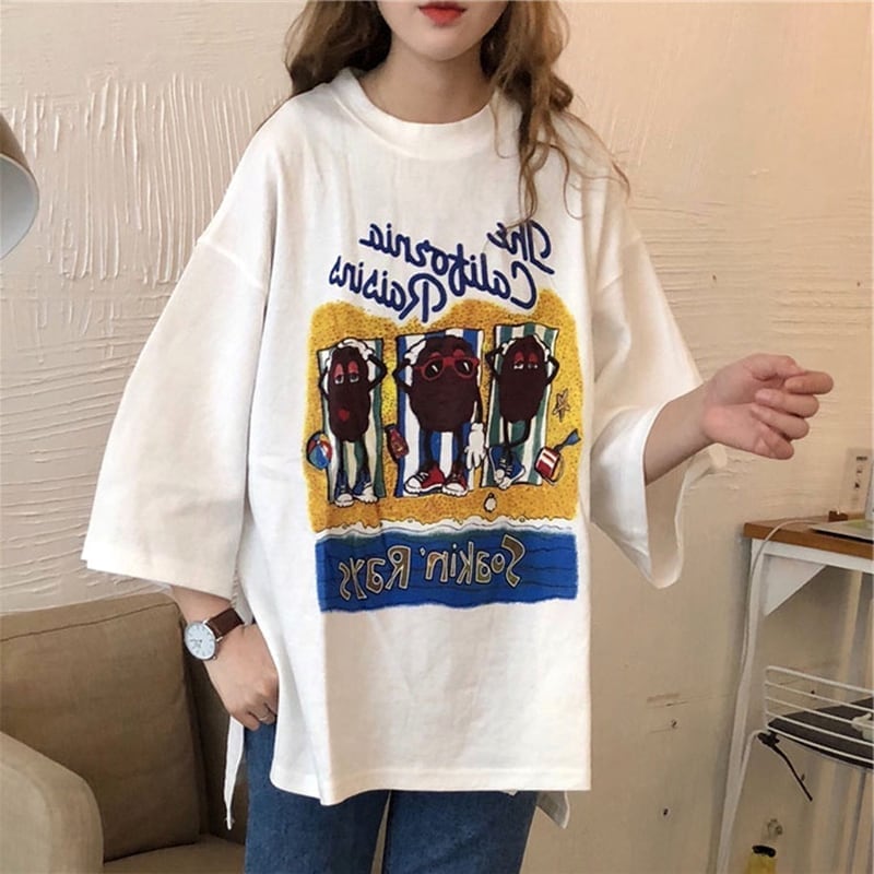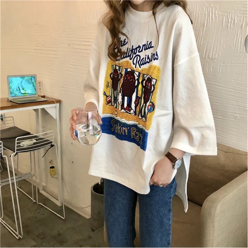 合わせやすい 美人度アップ 切り替え プリント Tシャツ カットソー<ins-3447>