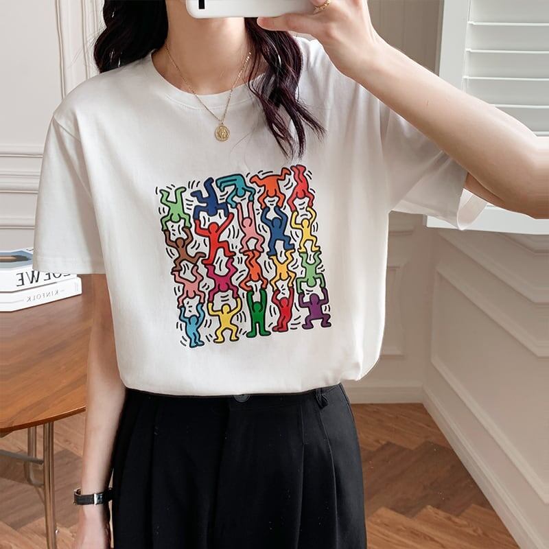 オシャレ度満点 着心地抜群 切り替え プリント Tシャツ カットソー<ins-3408>