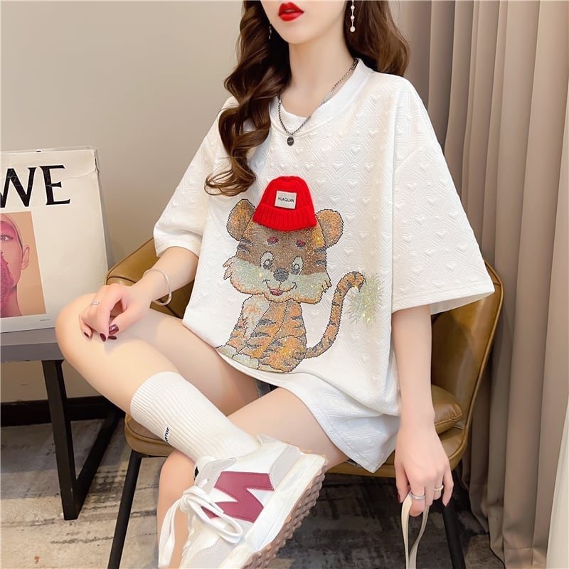 デザイン感 チャーミング 切り替え プリント Tシャツ カットソー<ins-3401>