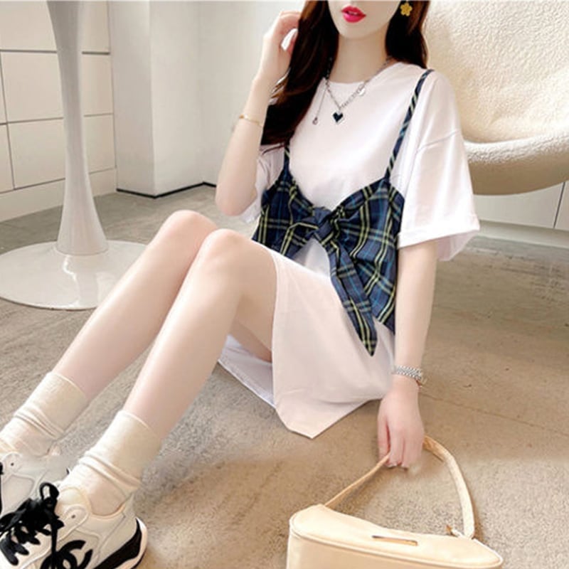 美人度アップ 美腿効果抜群 プリント Tシャツ カットソー ワンピース<ins-3357>