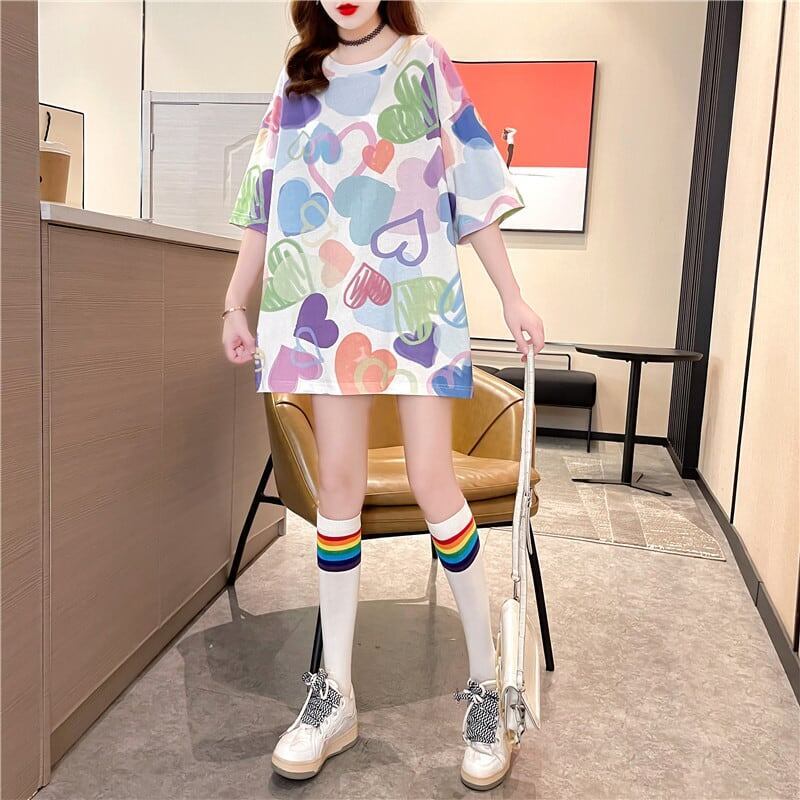 美人度アップ ファッション プリント Tシャツ カットソー ワンピース<ins-3303>