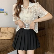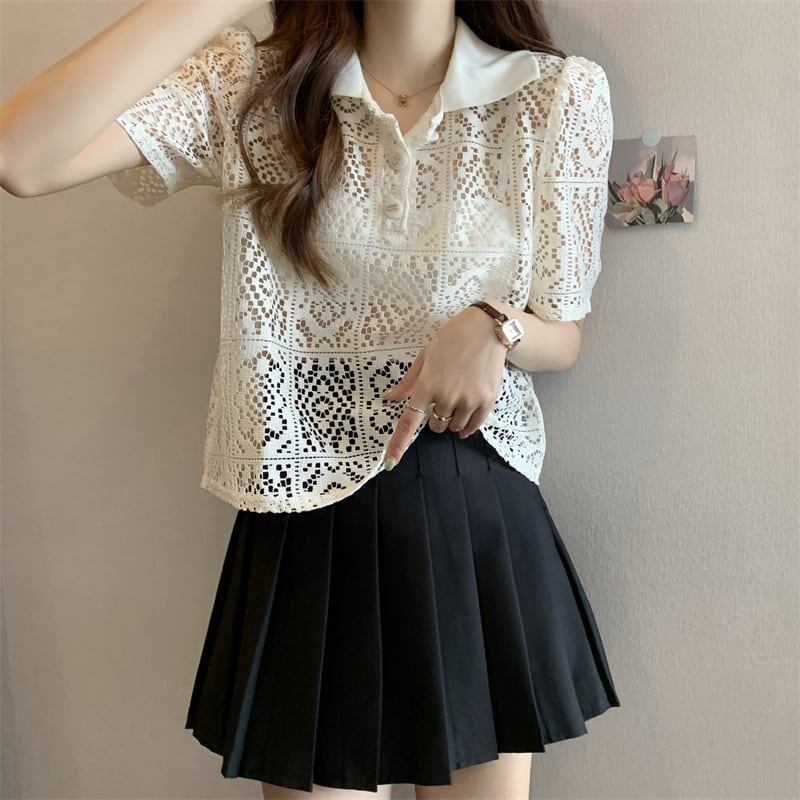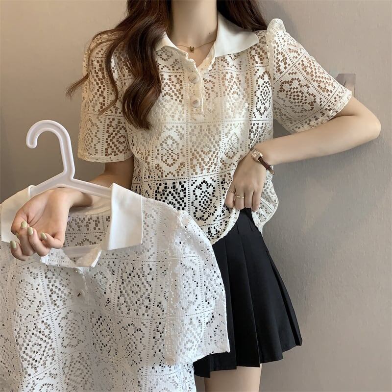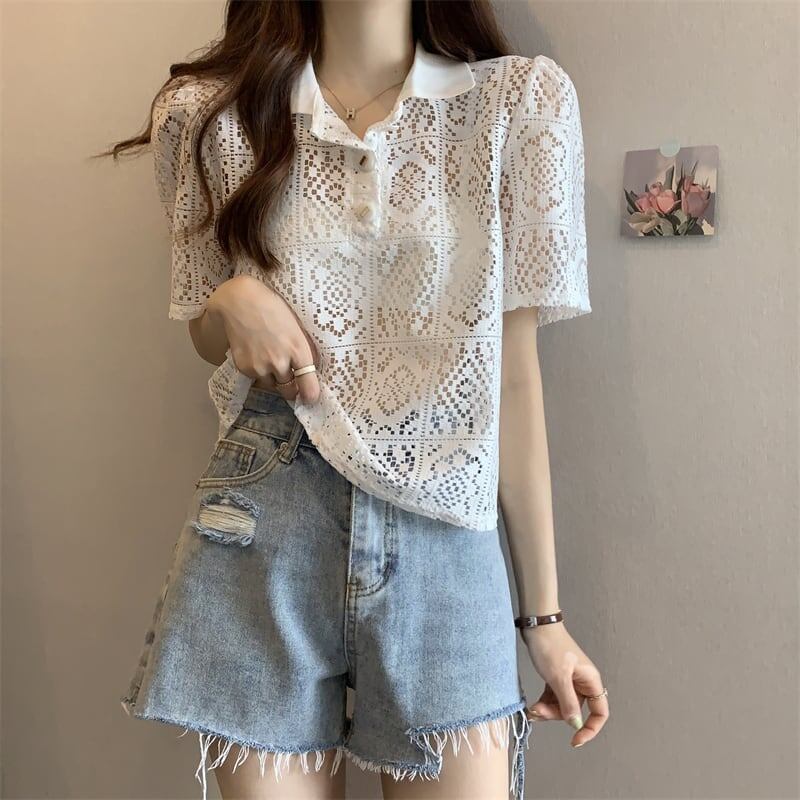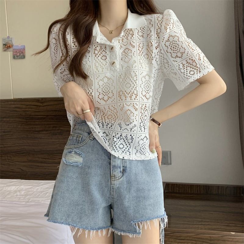 ファッション 美人度アップ 透かし彫り POLOネック Tシャツ カットソー<ins-3234>