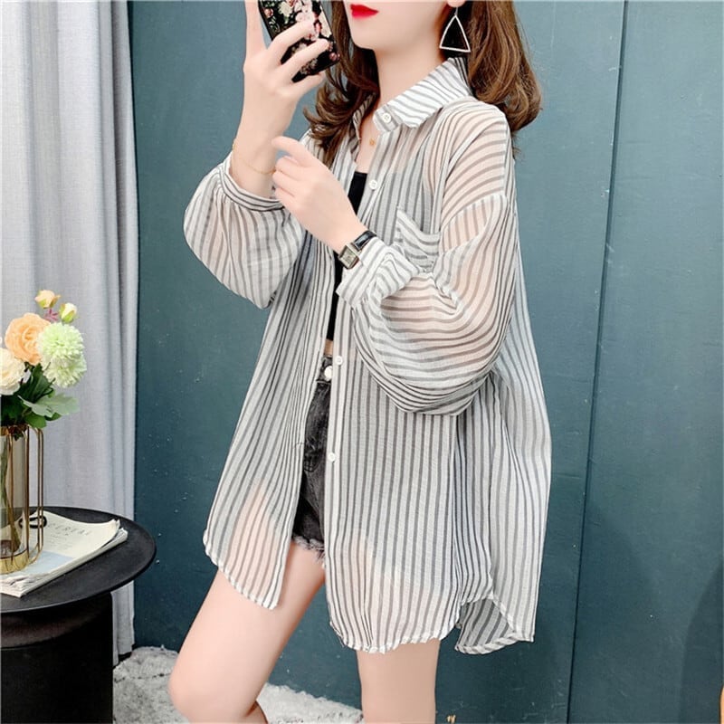 オシャレ度満点 日焼け対策 ストライプ シャツ ブラウス トップス<ins-3204>