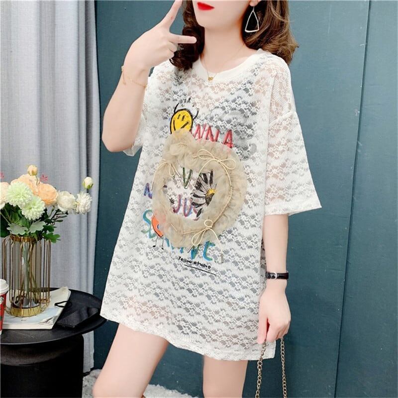 デザイン感 チャーミング 透かし彫り プリント Tシャツ カットソー<ins-3199>