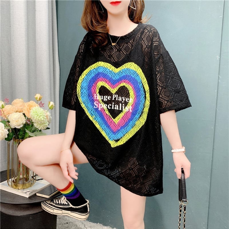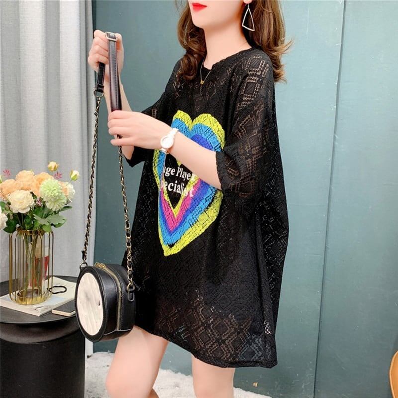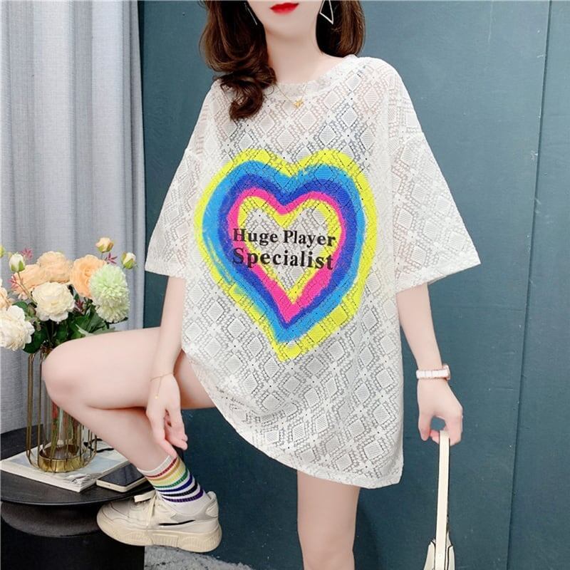 デザイン感 チャーミング 透かし彫り プリント Tシャツ カットソー<ins-3115>