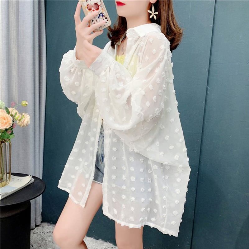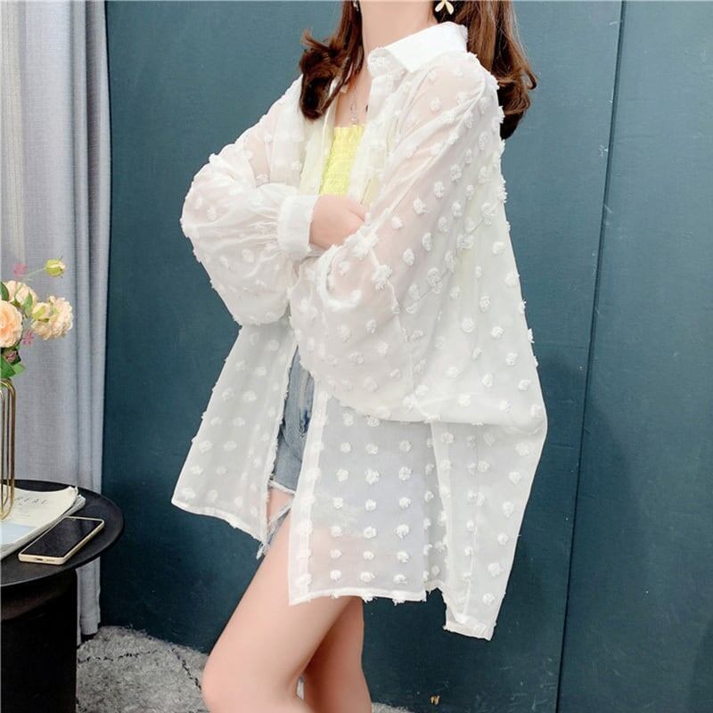 ルーズ 透け感 日焼け対策 POLOネック 3色選択可 シャツ ブラウス<ins-2937>