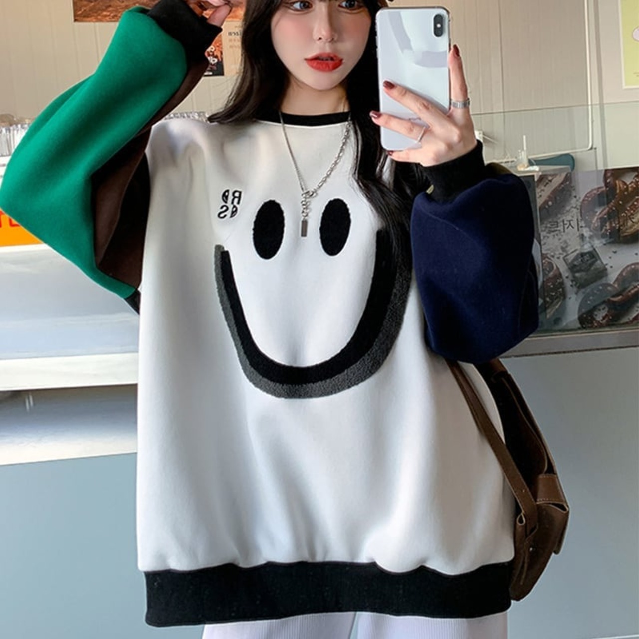ゆったり感アップ オシャレ度満点 ラウンドネック プリント スウェット パーカー<ins-2932>