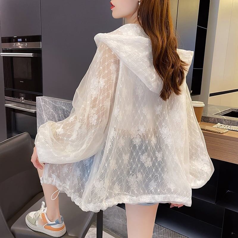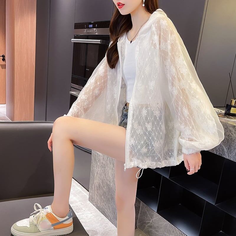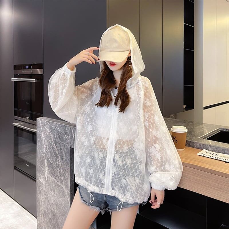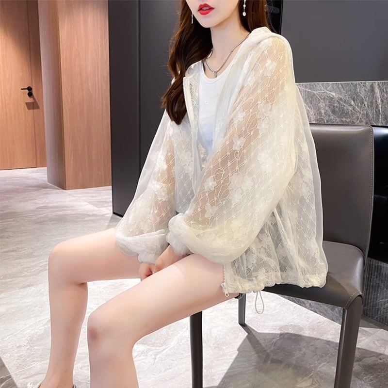 新作 透け感 日焼け対策 冷房対策 UVカット フード付き パーカー <ins-1986>