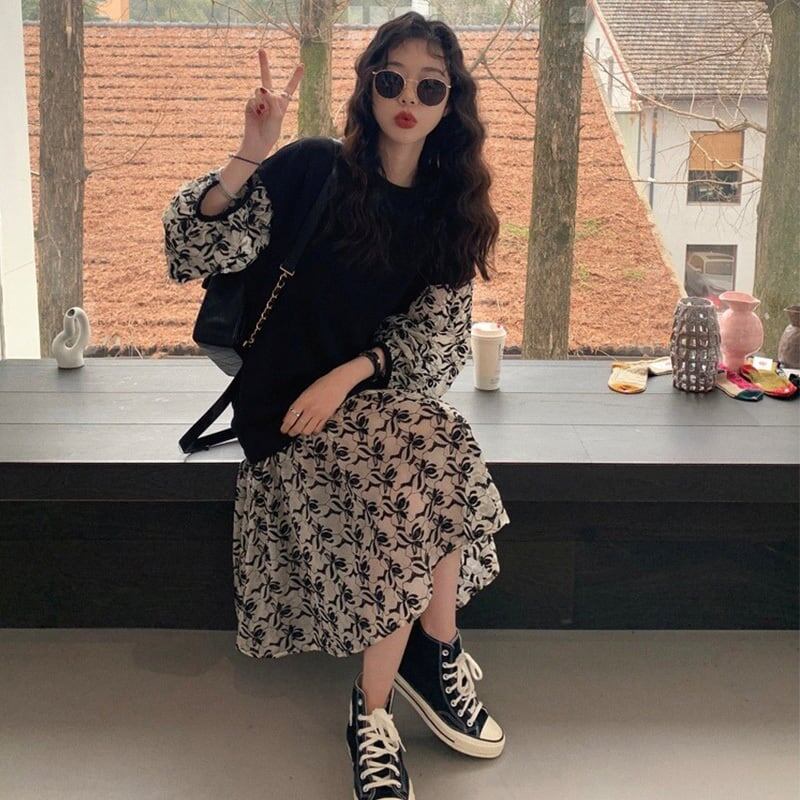 清純甘くて女子力UP 美感いっぱい ラウンドネック 切り替え ワンピース<ins-2928>
