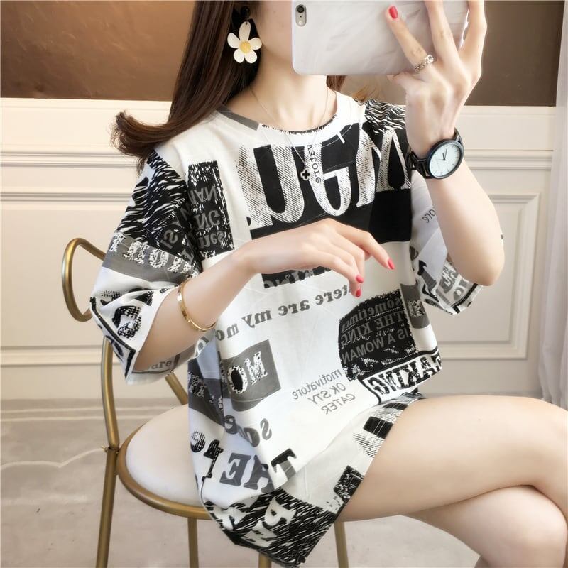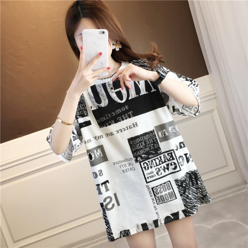 カジュアル オシャレ度満点 ラウンドネック プリント Tシャツ カットソー<ins-2947>