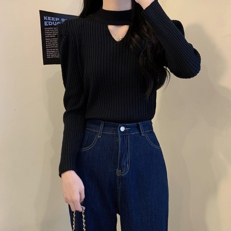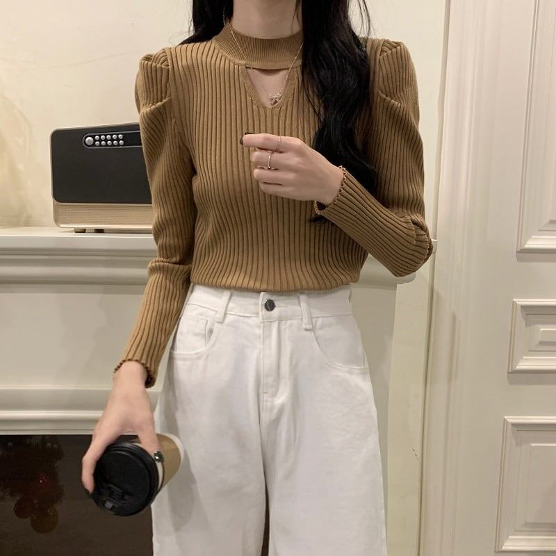デザイン感 チャーミング 無地 長袖 切り替え セーター トップス<ins-2900>