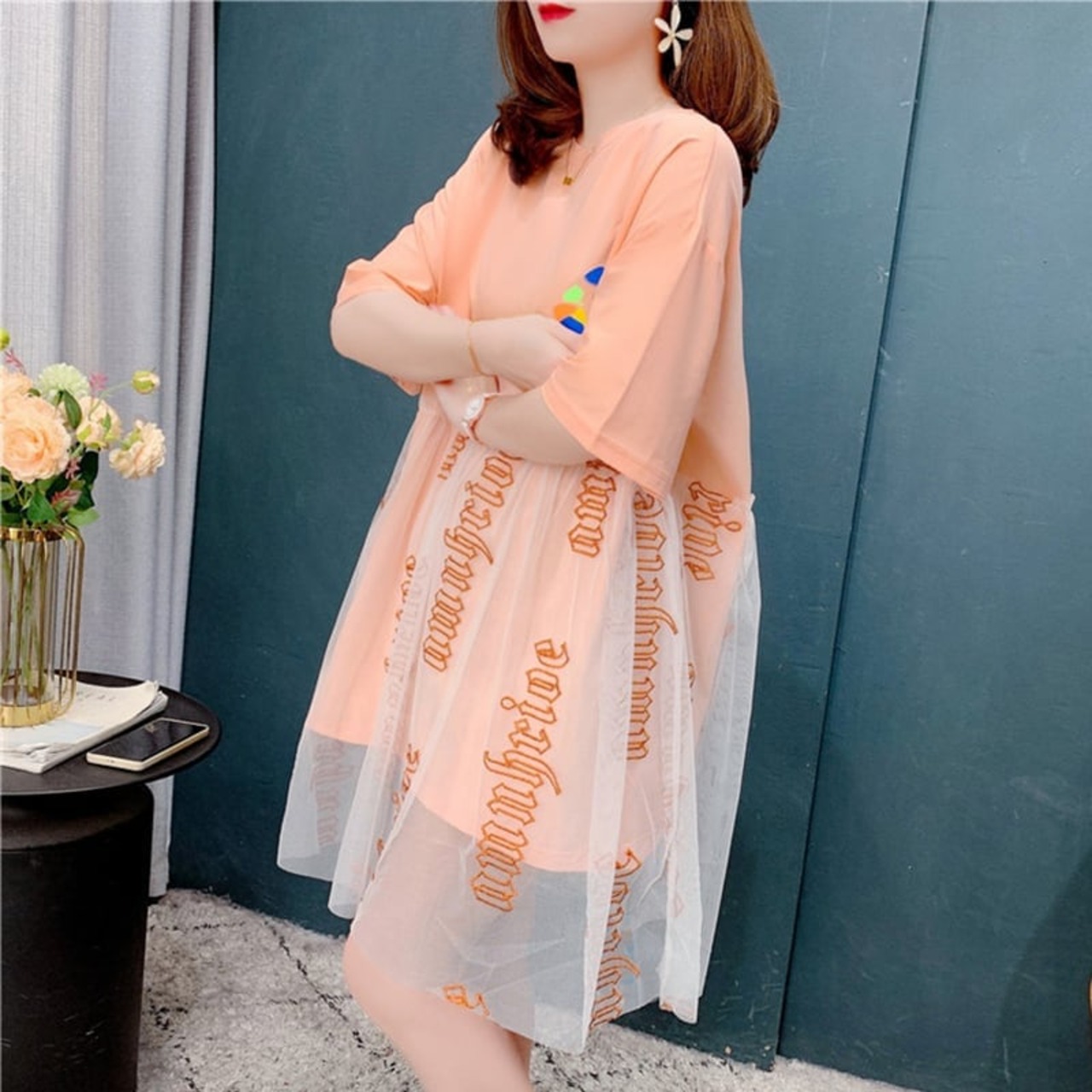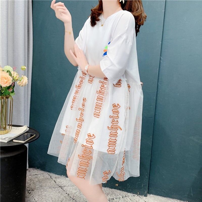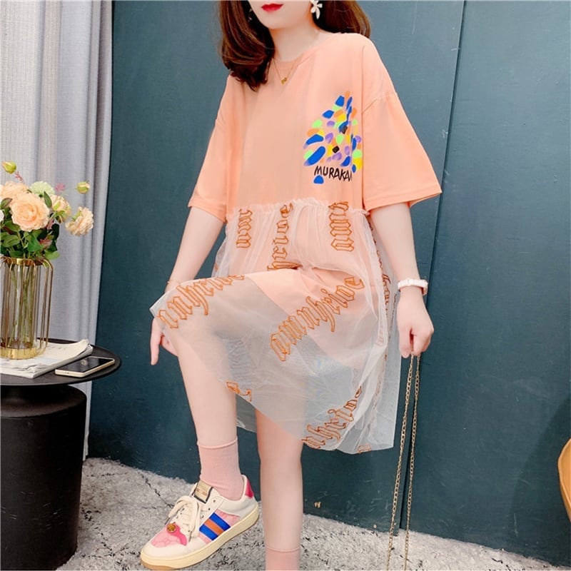 個性的なデザイン 着心地抜群 プリント Tシャツ カットソー ワンピース<ins-3607>