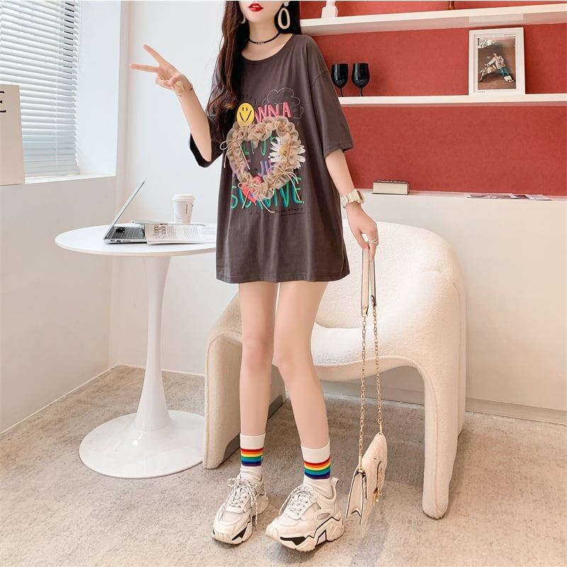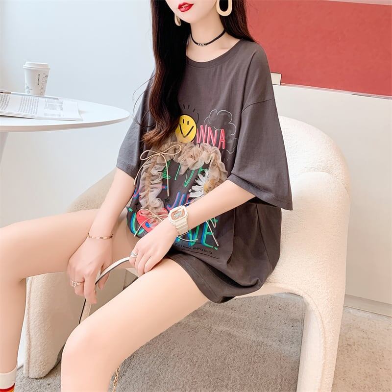 デザイン感 チャーミング 切り替え プリント Tシャツ カットソー<ins-3529>