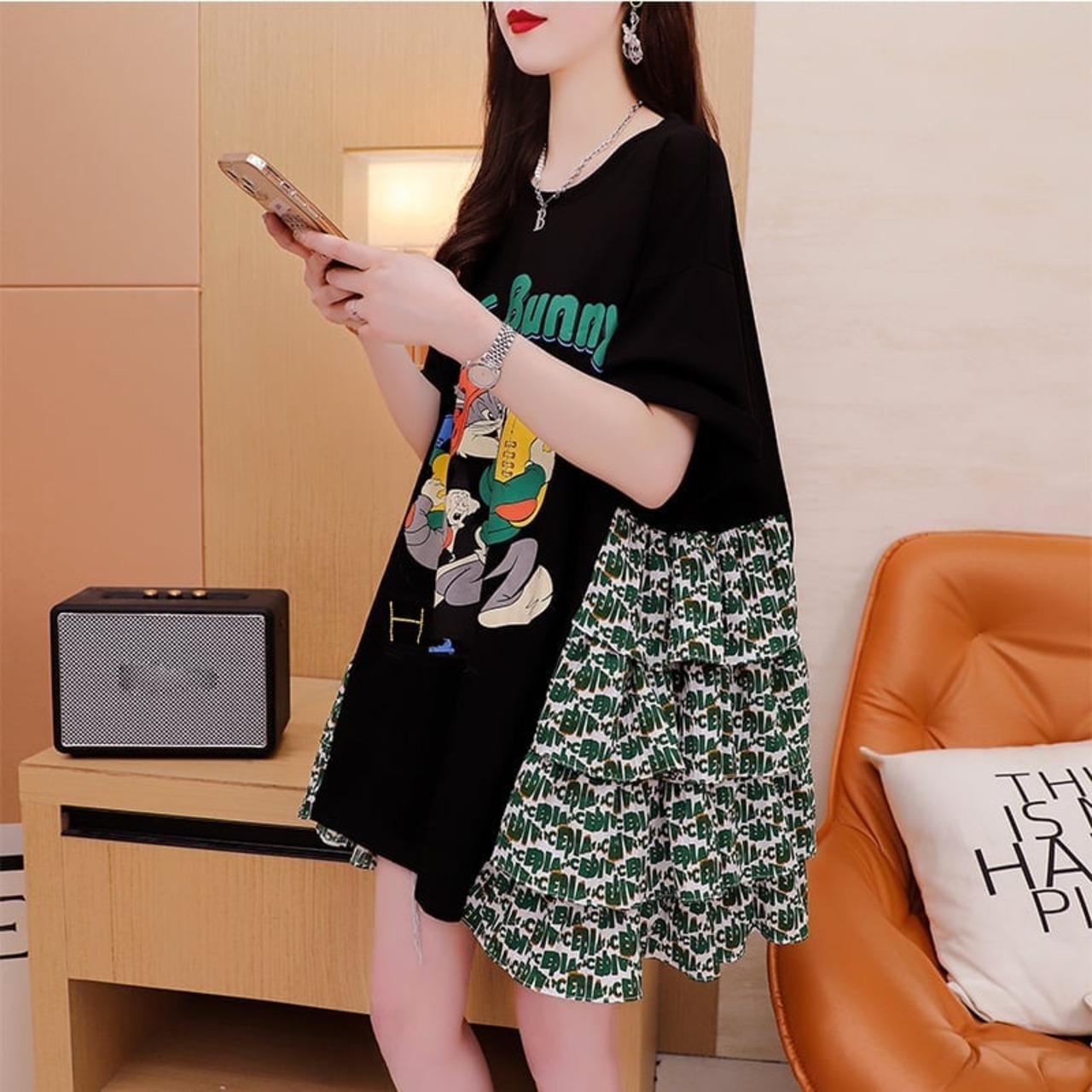 デザイン感 チャーミング プリント Tシャツ カットソー ワンピース<ins-3508>