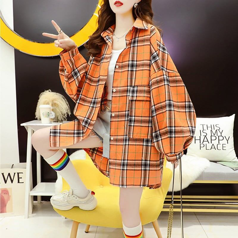 レトロ 好感度満載 チェック柄 切り替え 長袖 シャツ ブラウス<ins-2835>