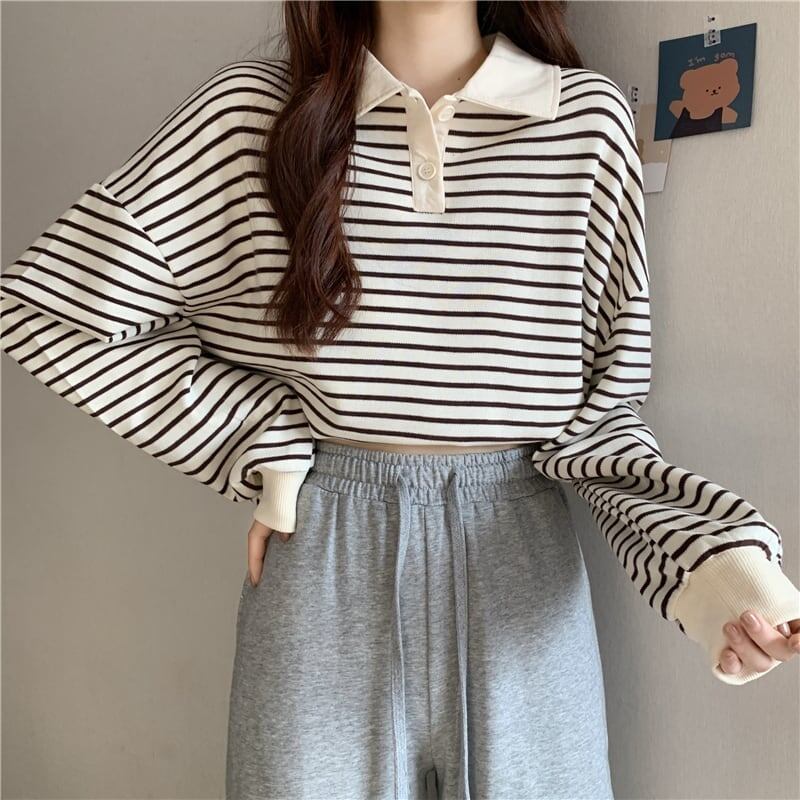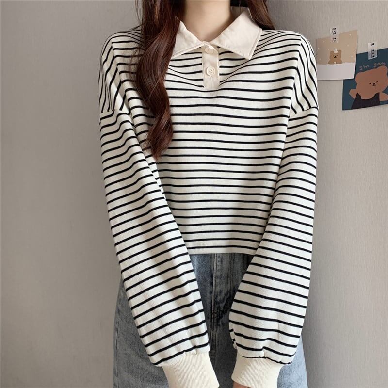 お洒落 清純甘くて女子力UP POLOネック ボーダー柄 スウェット パーカー<ins-2841>