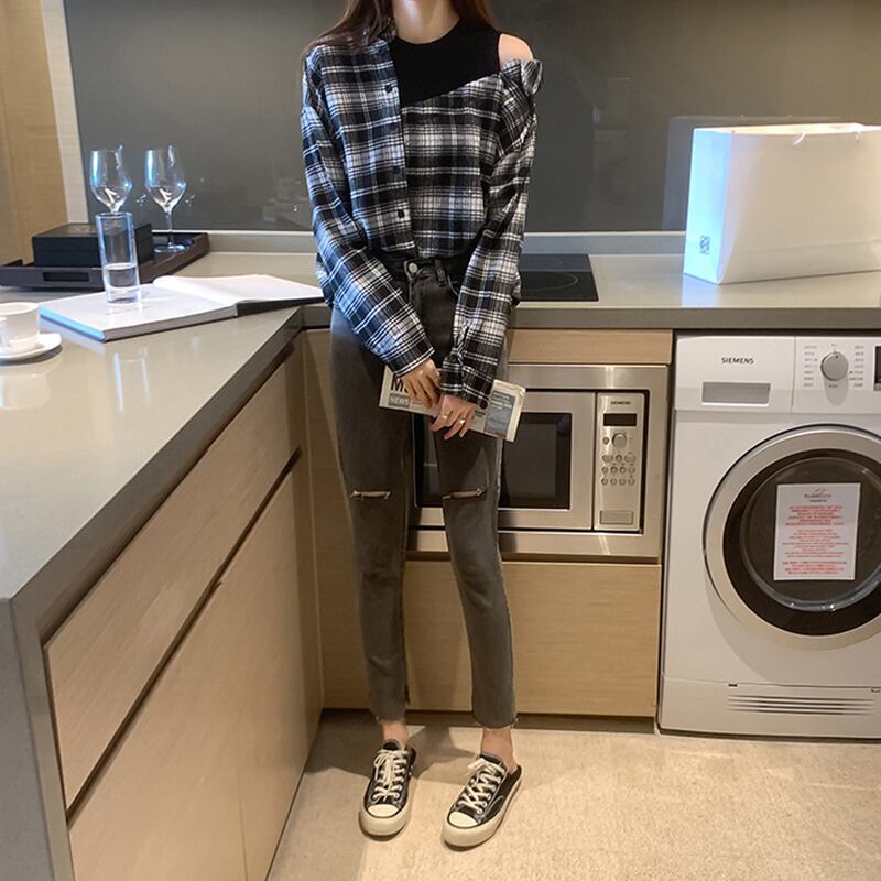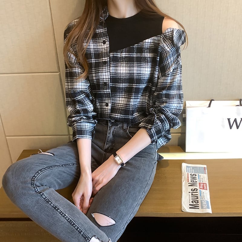 カジュアル イレギュラー 長袖 チェック柄 シャツ ブラウス トップス<ins-2250>
