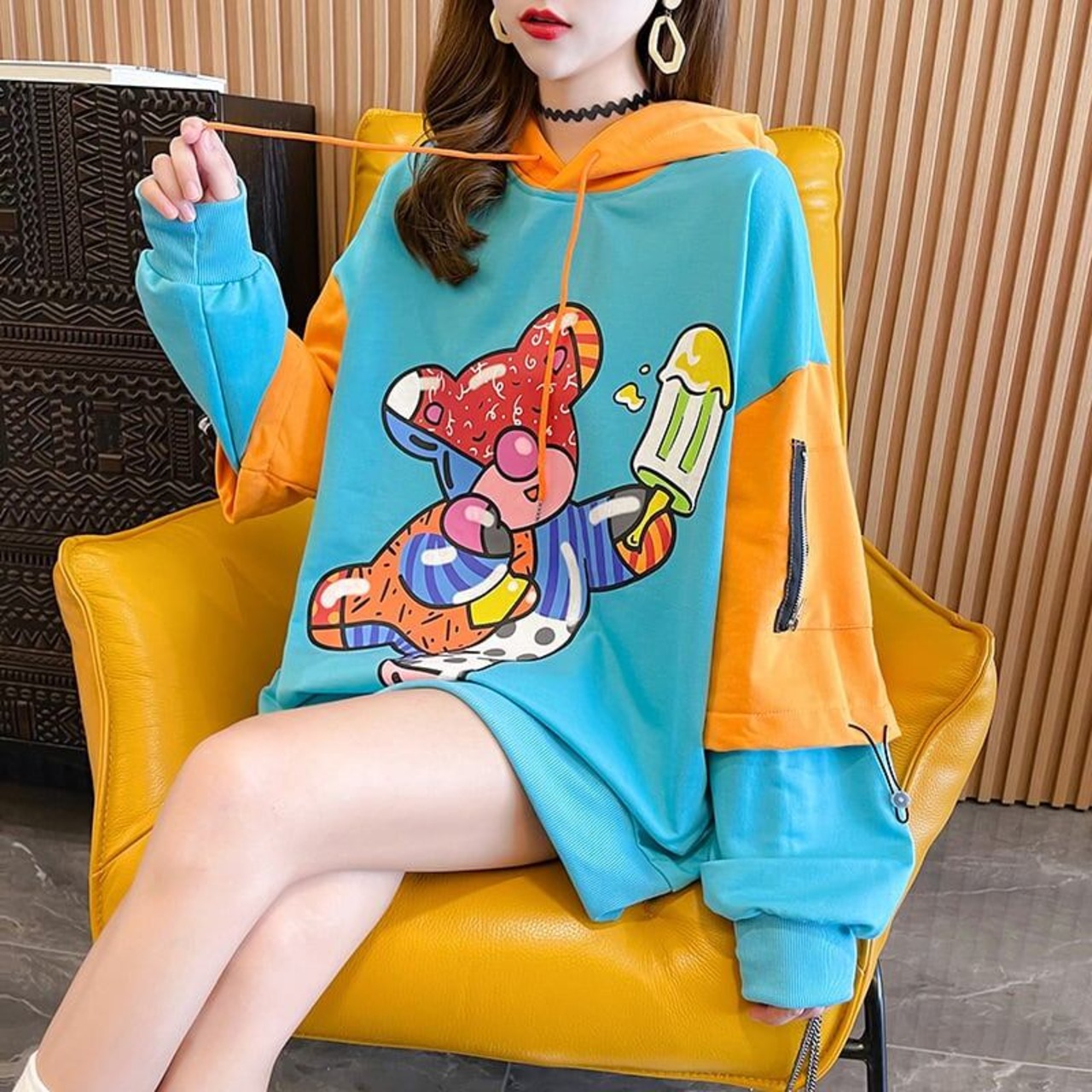 ルーズ デザイン感 カートゥーンプリント 切り替え 長袖 スウェット パーカー<ins-2205>