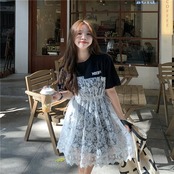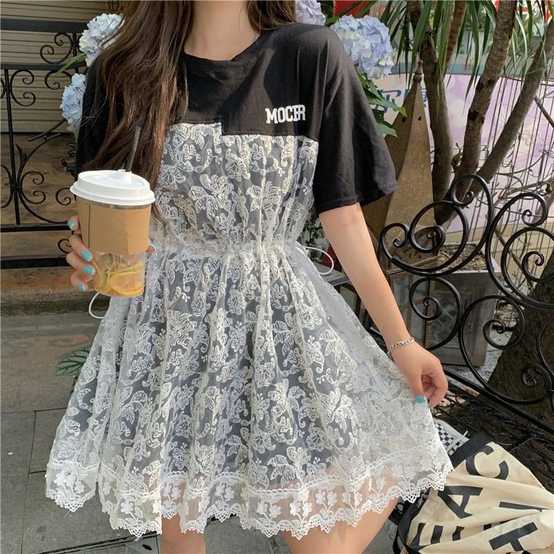売れ筋 レース 切り替え フェイクレイヤード 膝丈 半袖 Tシャツワンピース <ins-1953>