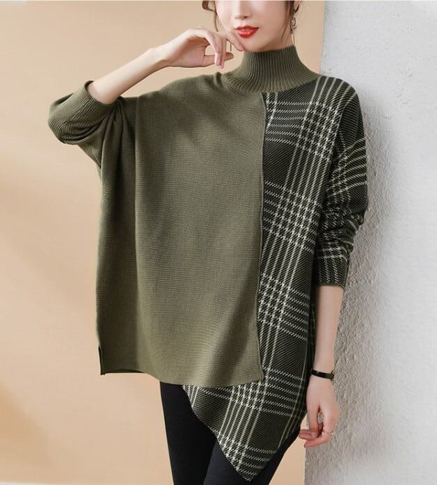 イレギュラー 個性的なデザイン ハイネック 切り替え 3色選択可 ニット セーター<ins-2491>