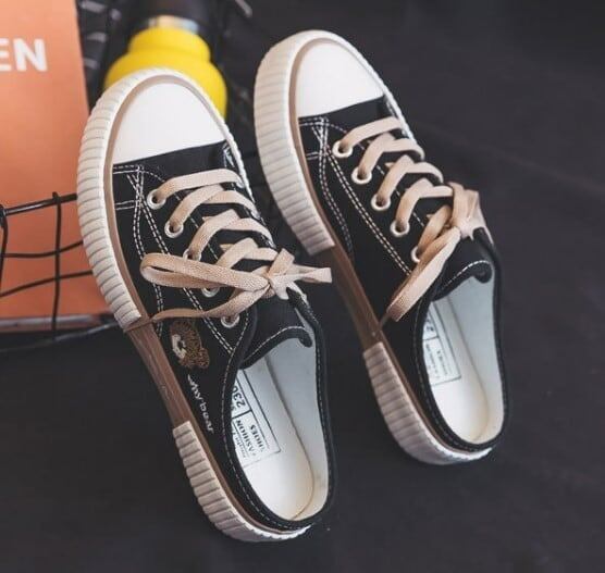 韓国系熊柄カジュアルキャンバススニーカー ホワイト/ブラック<ins-1720>