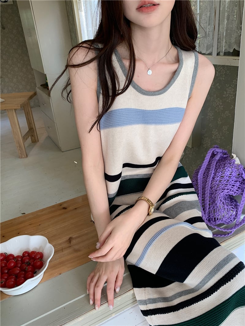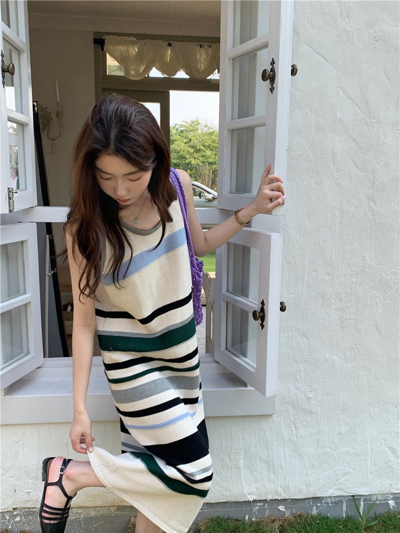新商品 カジュアル シンプル ストライプ柄 ニットワンピース<ins-8509>