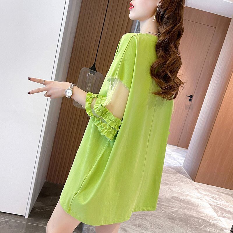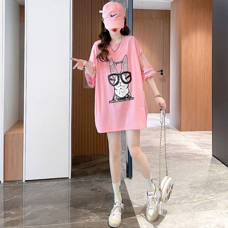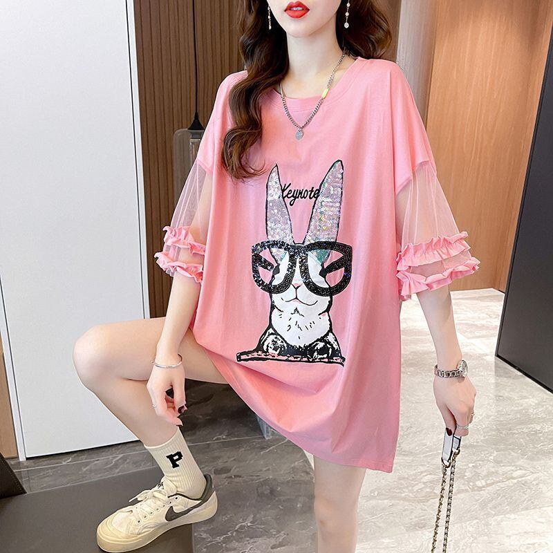 着回し力抜群 新作 チュール 切り替え ピンク プリント スパンコール プリント全3色 半袖Tシャツ カットソー <ins-8557>