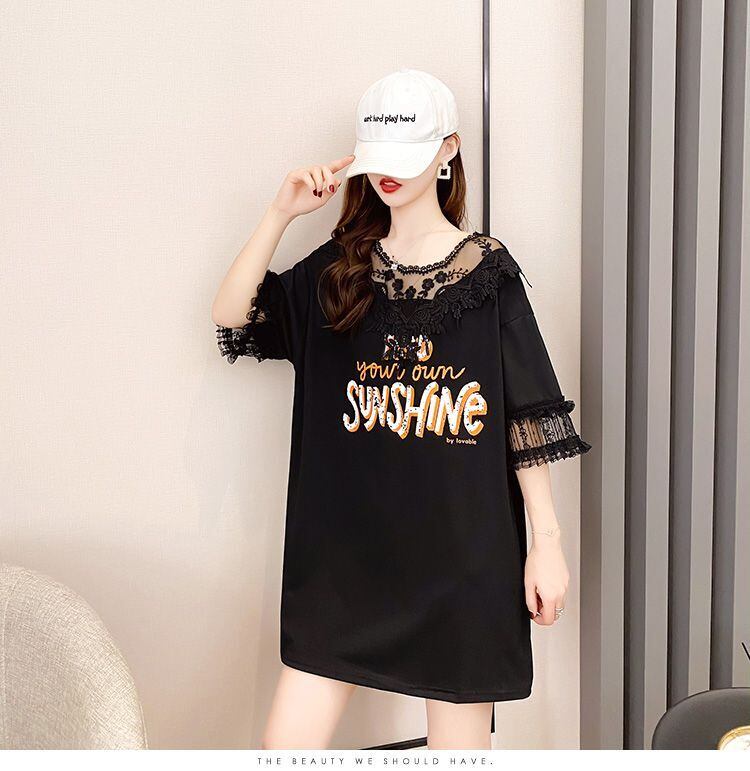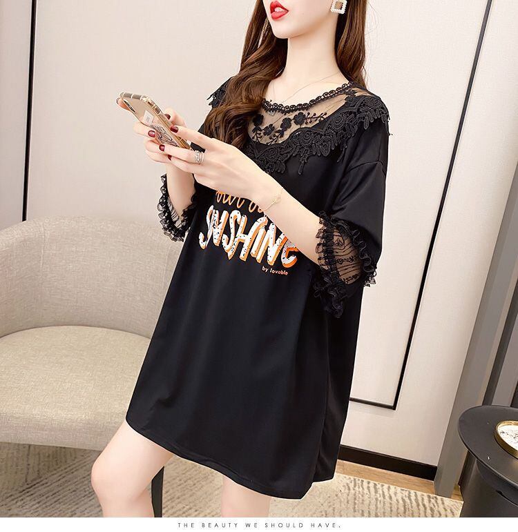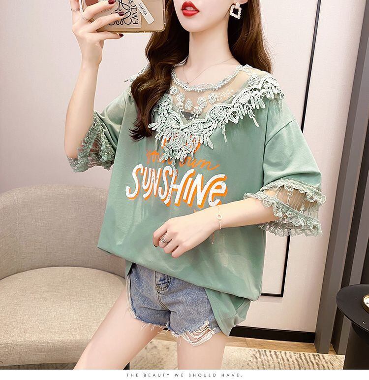 話題沸騰中 大好評 レース 透かし彫り 切り替え プリント全3色 半袖Tシャツ カットソー <ins-8562>