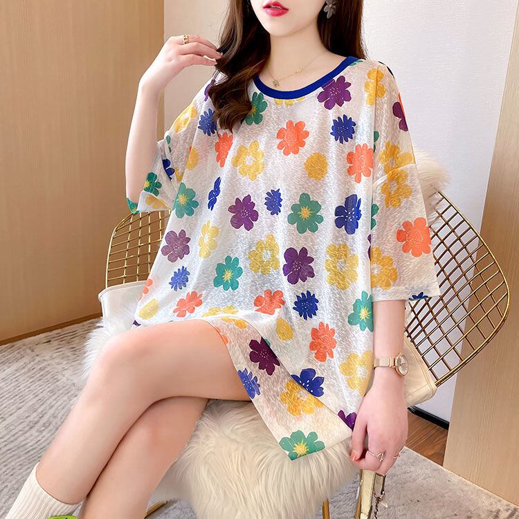 大人可愛い 紫外線対策 半袖 ラウンドネック ルーズ Tシャツ <ins-8642>