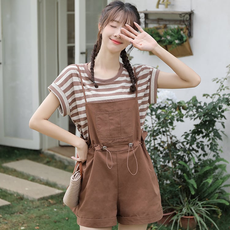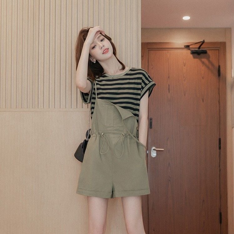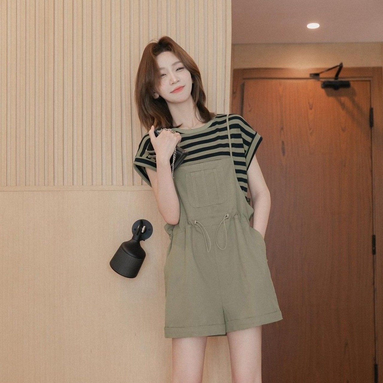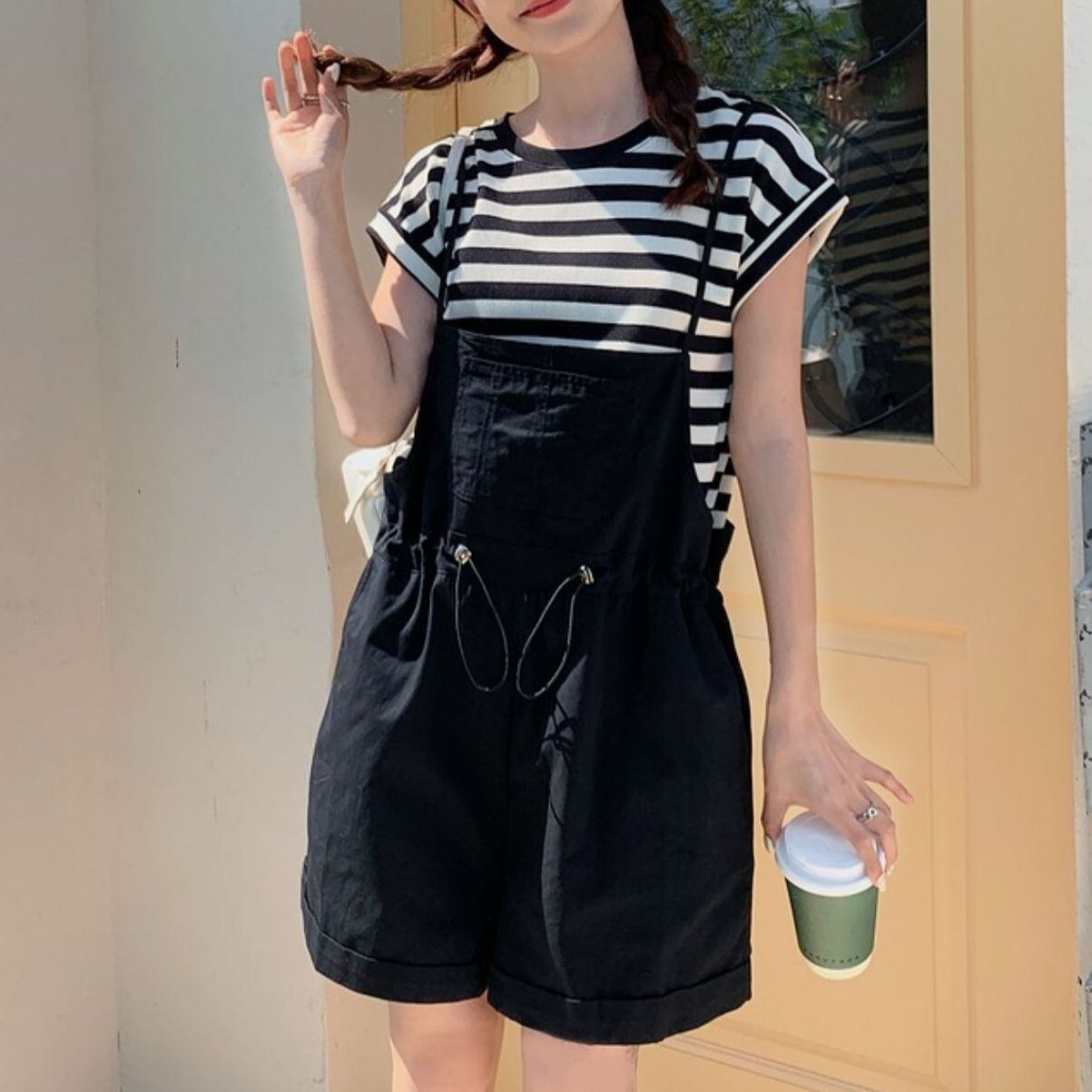 超人気 カジュアル ストライプ柄 切り替え 半袖Tシャツⅹオーバーオールショーツ全4色 <ins-8731>