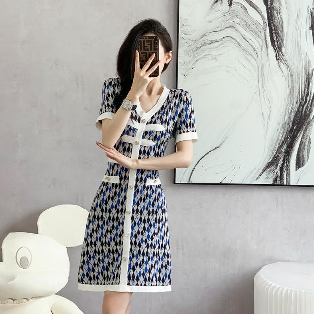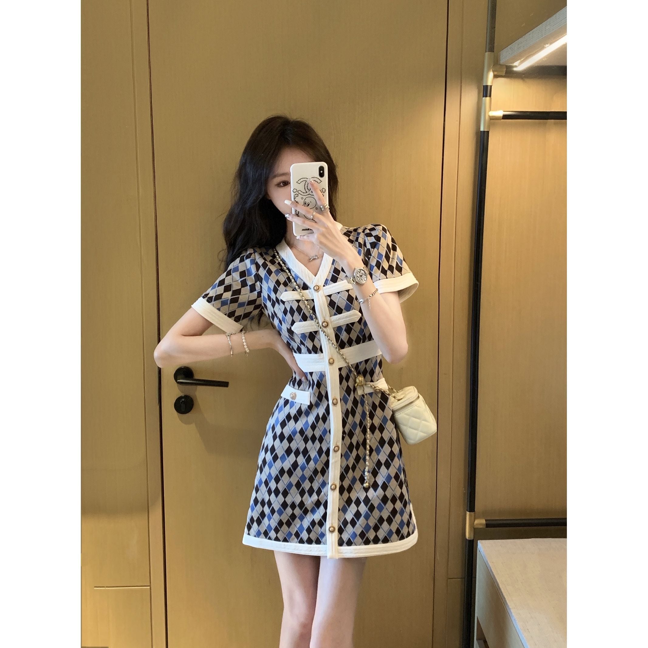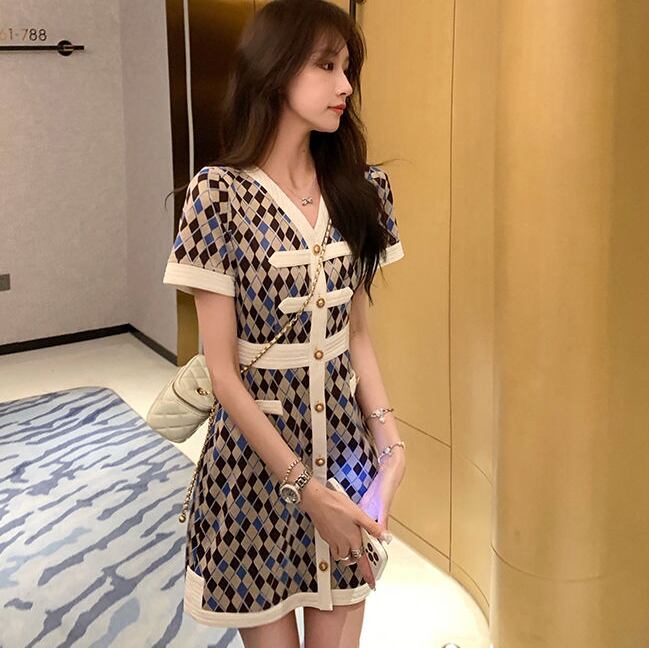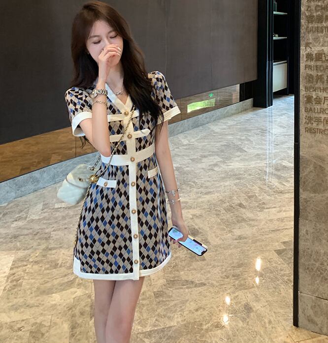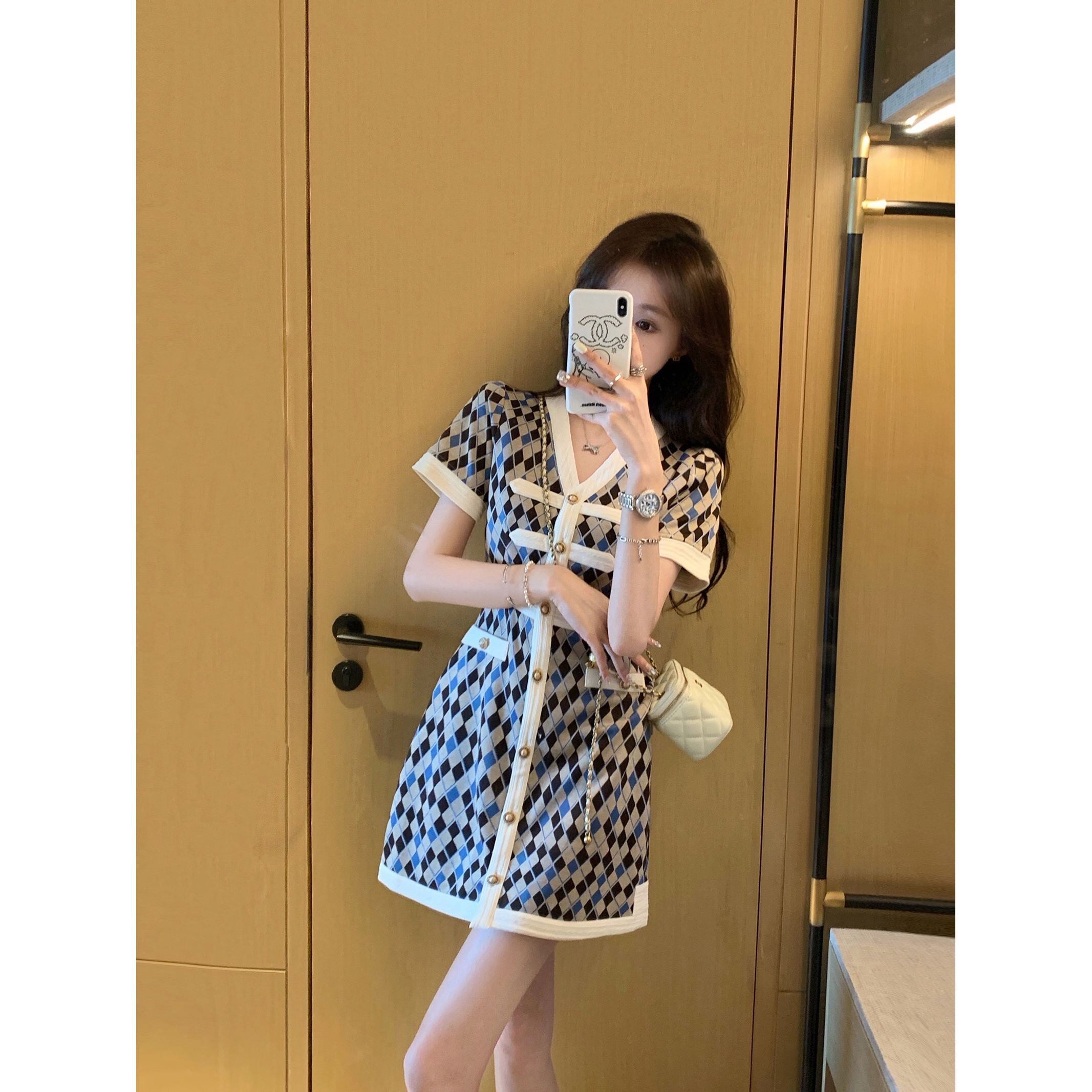 超人気 上質 エレガント 知的 Vネック 切り替え チェック柄 Aライン ワンピース<ins-8922>
