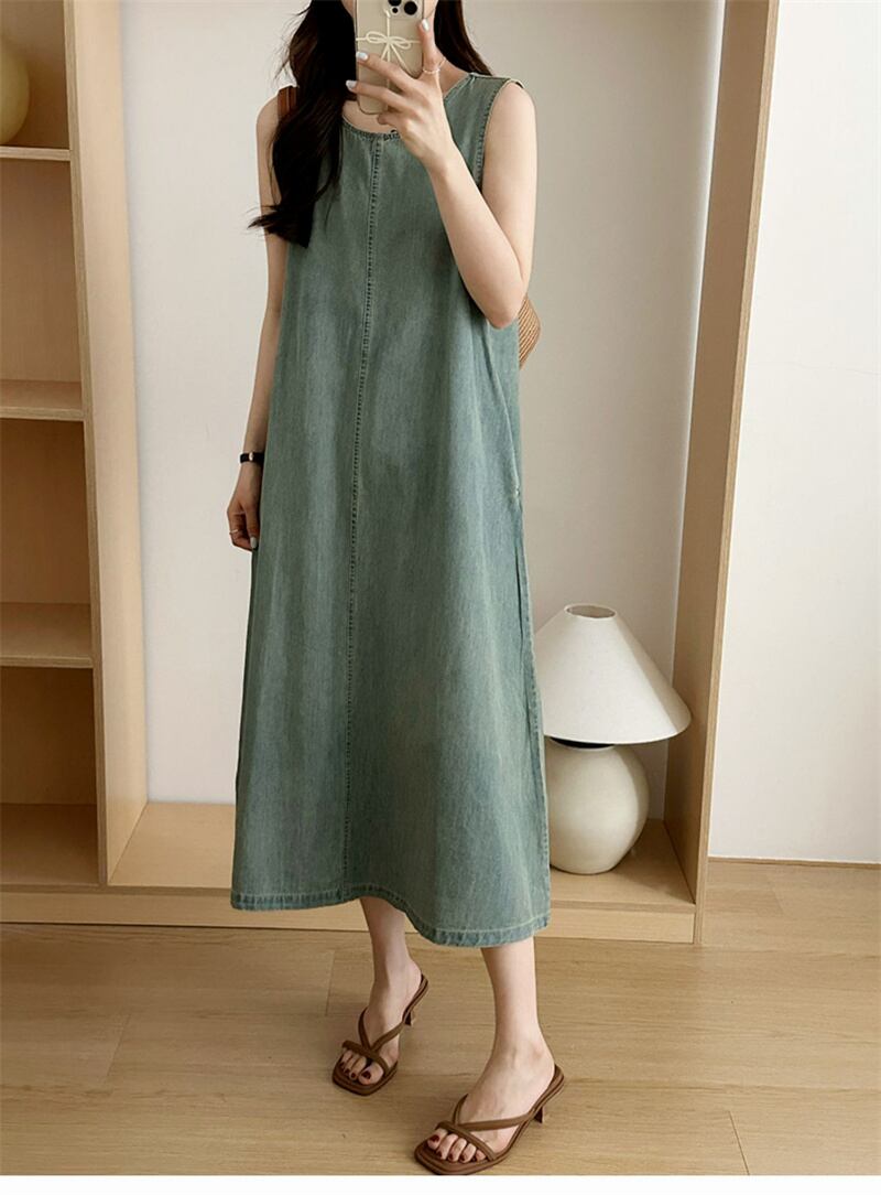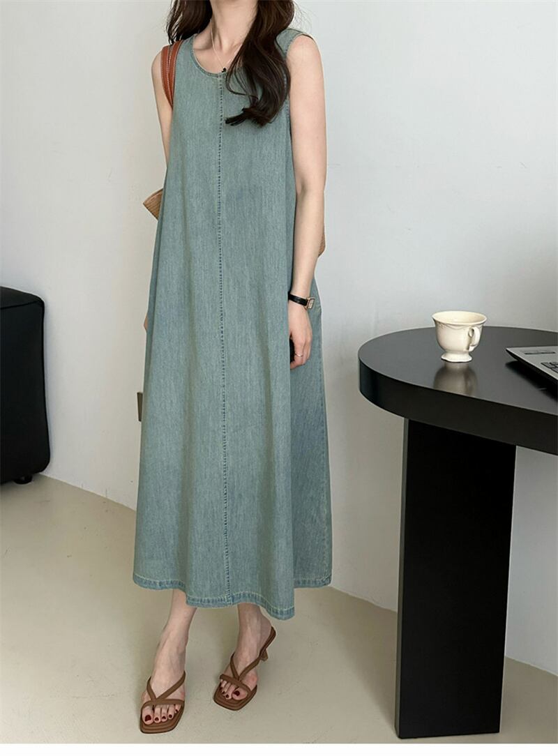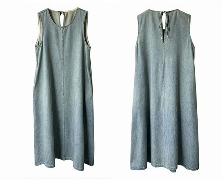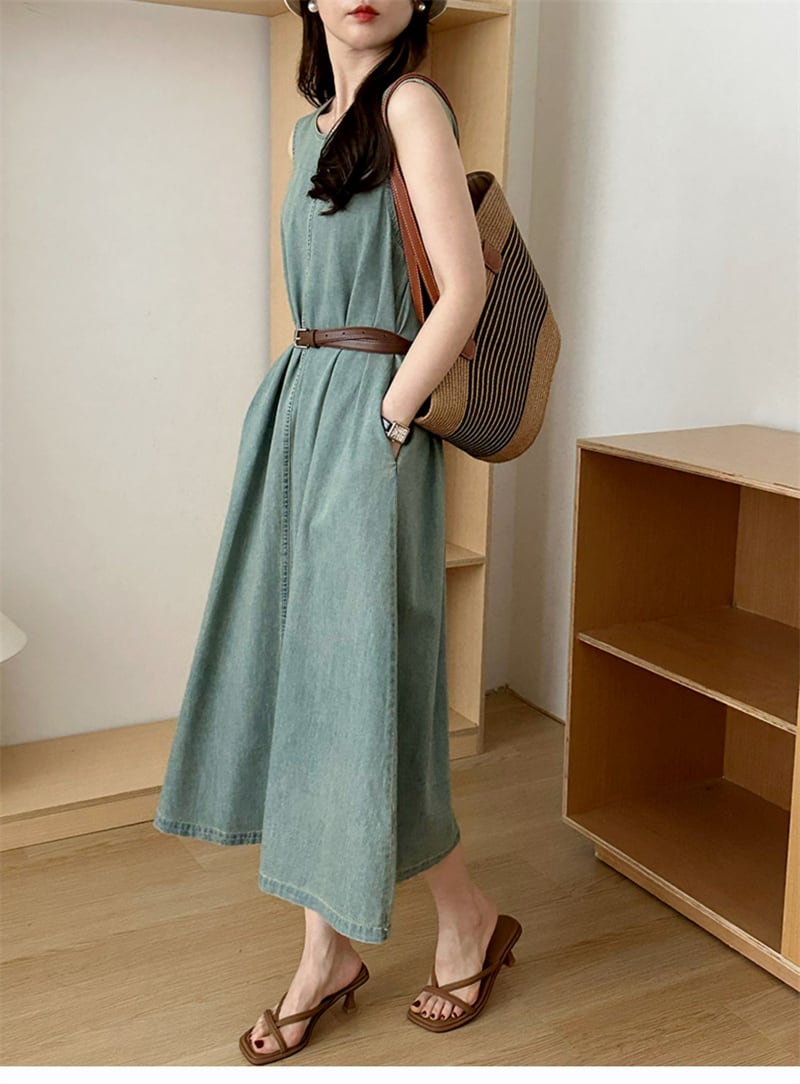 新商品 カジュアル シンプル マッチングベルト付き ノースリーブ デニム ワンピース<ins-8923>