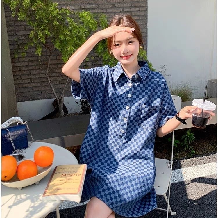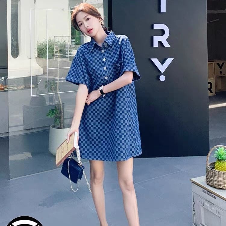 期間限定 上質 ファッション チェック柄 ルーズ デニム ワンピース<ins-8961>