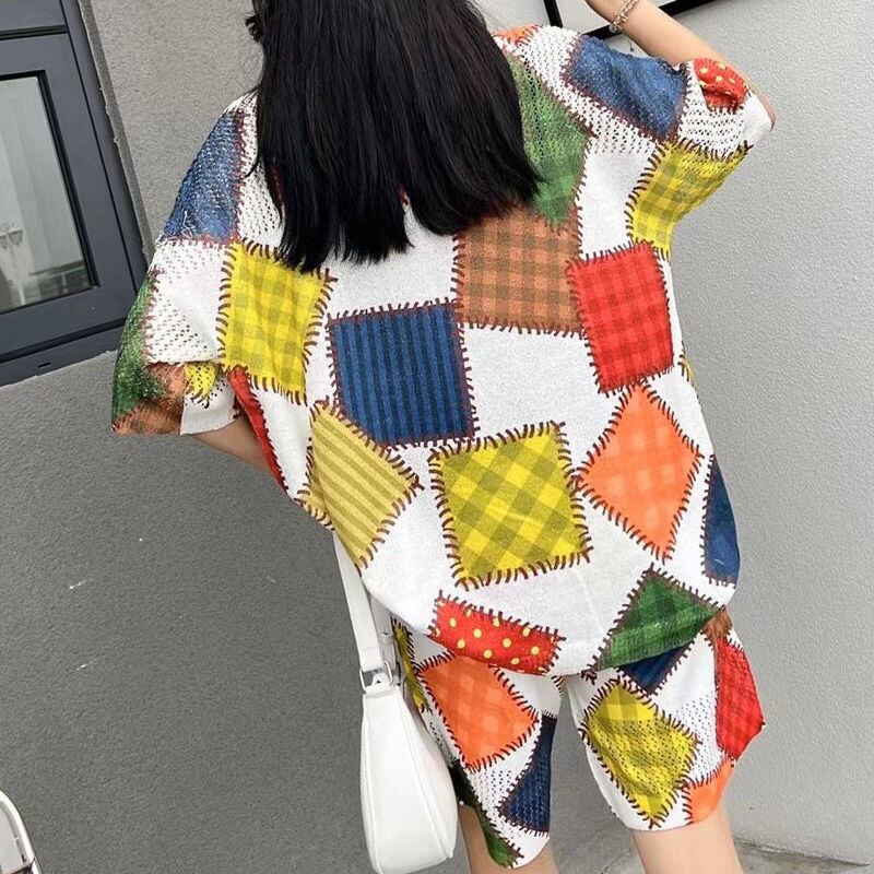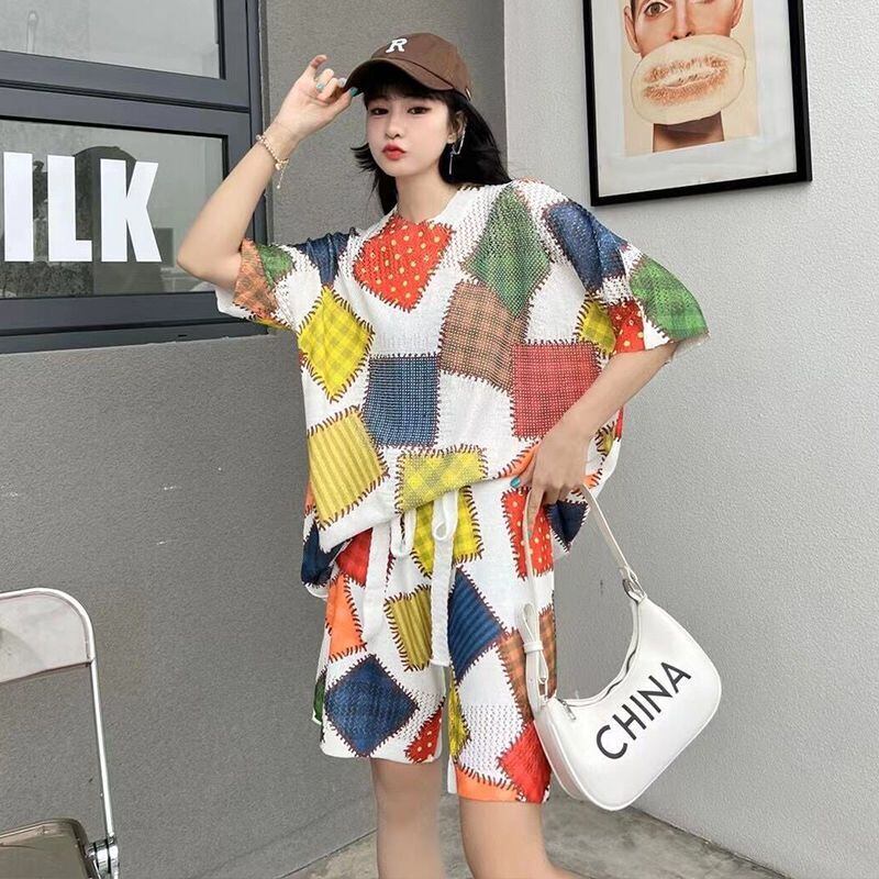 絶対欲しい ジオメトリック柄 アイスシルクニット 半袖 Tシャツ ショートパンツ セットアップ <ins-8983>