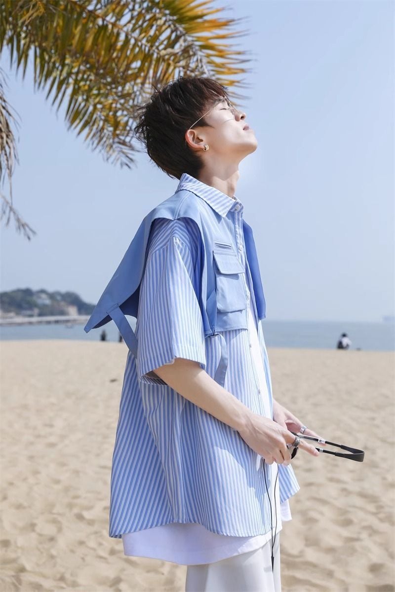 絶対流行 早い者勝ち レイヤード風 切り替え ストライプ柄 全3色 半袖Tシャツ<ins-9048>