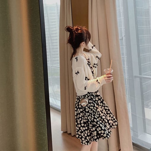 話題沸騰中 おしゃれ度高め 柔らかくて優しい印象 リボン 花柄 トップス+ワンピースセット<ins-9113>
