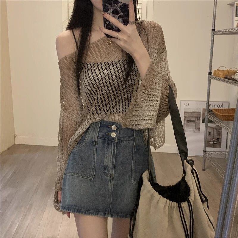 韓国風ファッション 柔らかくて優しい印象 透かし彫り ニットトップス<ins-9153>