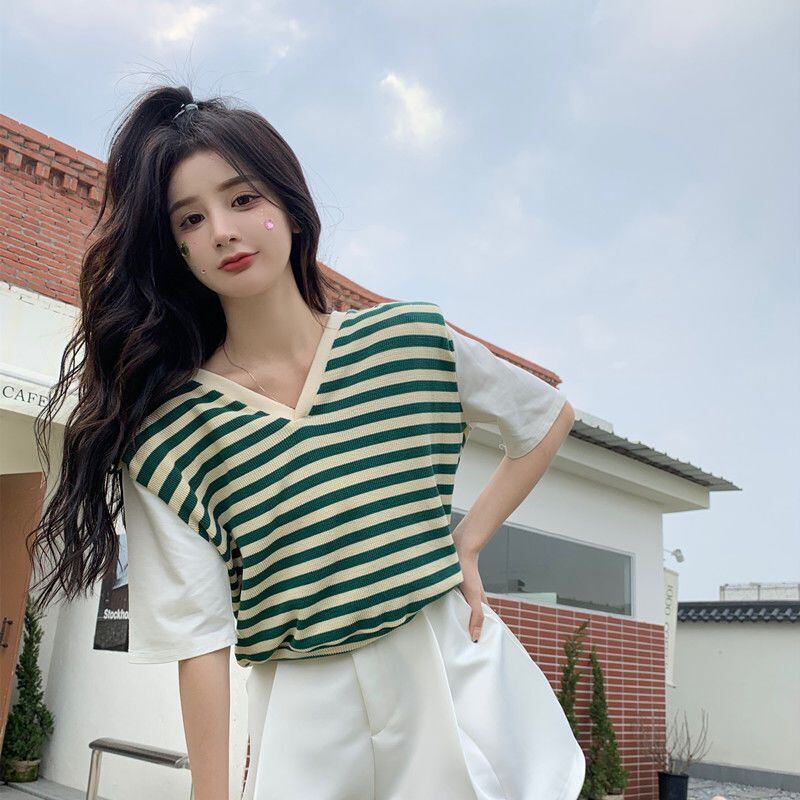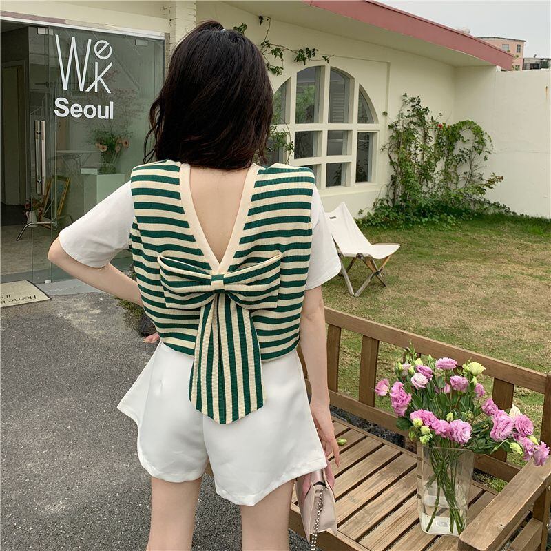 上質 好感度UP レイヤード風 ストライプ柄 リボン ニット 全2色 半袖Tシャツ< ins-9211>