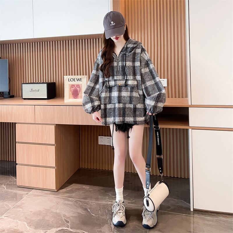 人気上昇中 スタイルアップ カジュアル チェック柄 2色選択 パーカー<ins-9291>