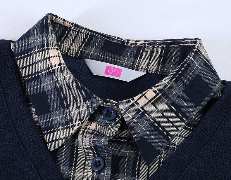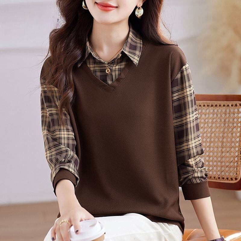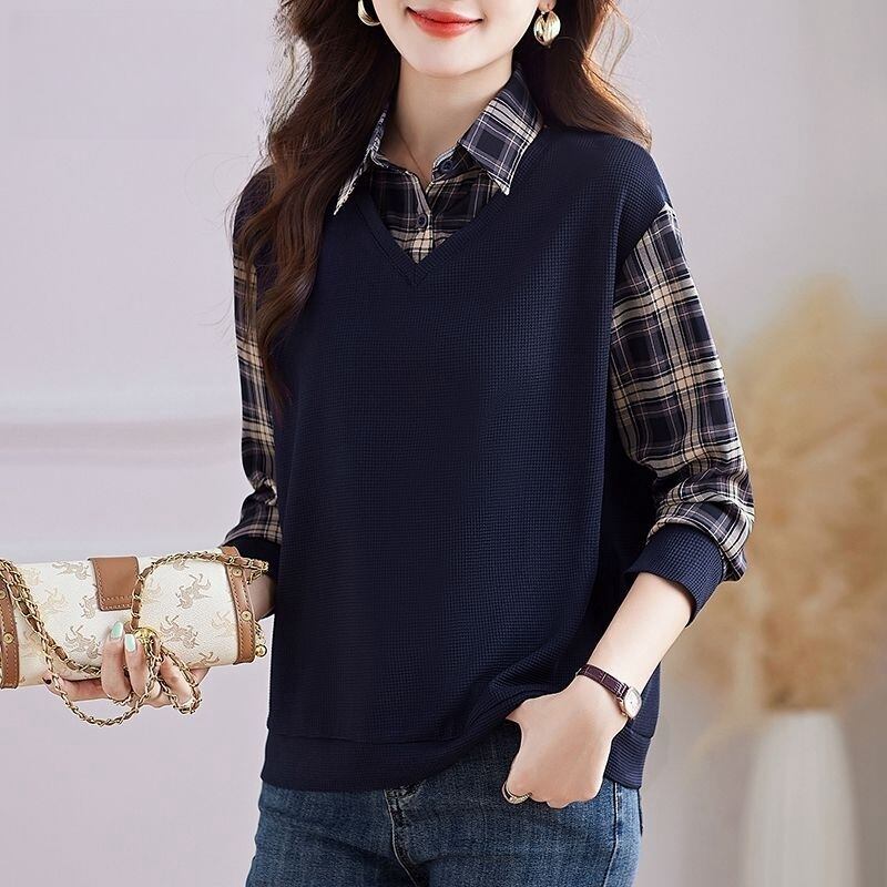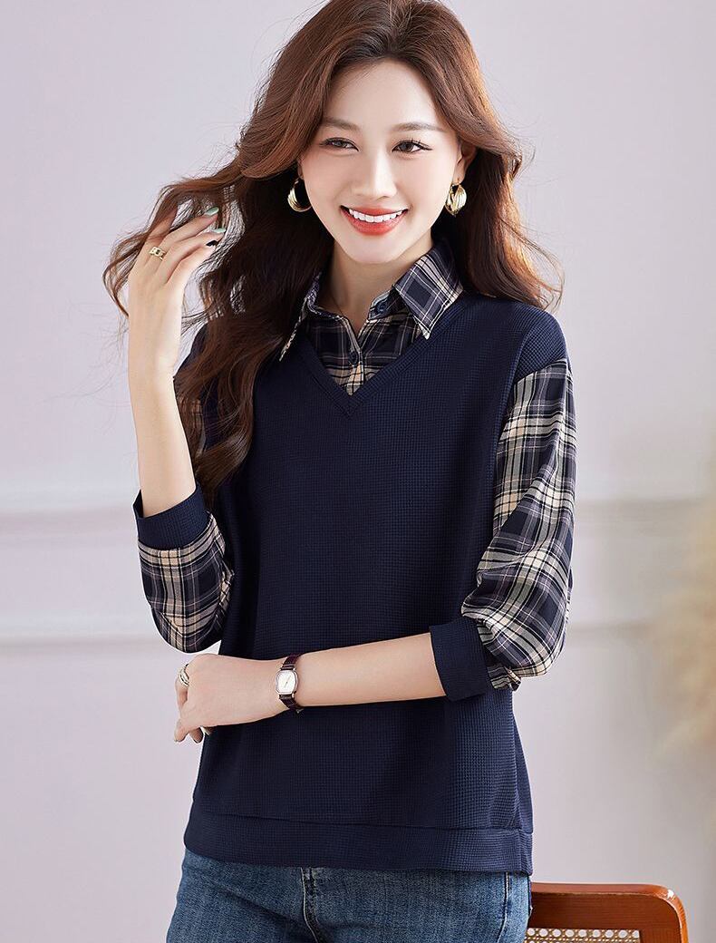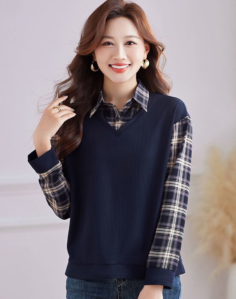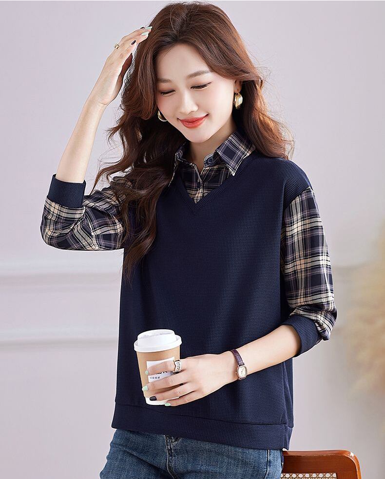売り切れ必至 スタイルアップ 着心地良い チェック柄 レイヤード風 トップス<ins-9515>