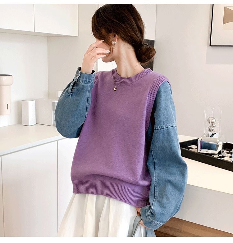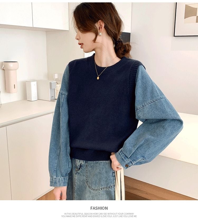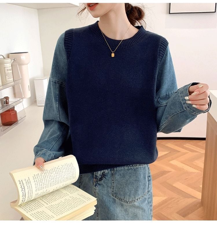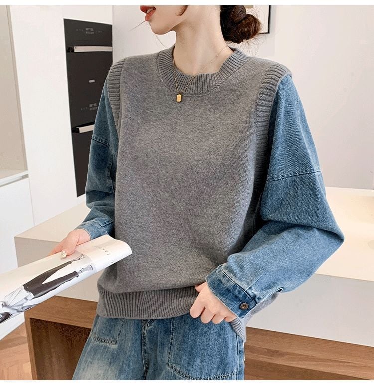 好感度UP スタイルアップ レイヤード風 デニム 切り替え 3色選択 ニットトップス<ins-9594>