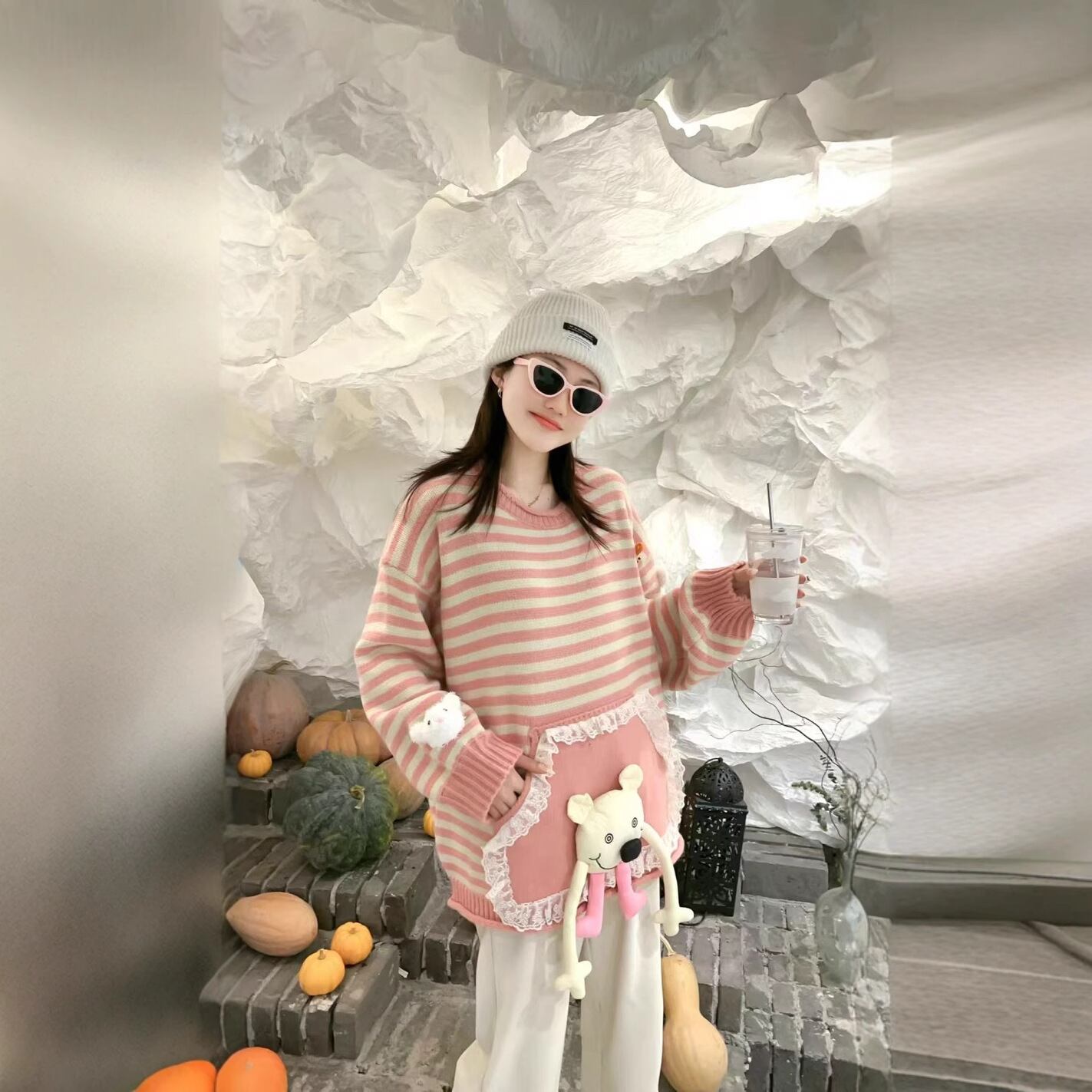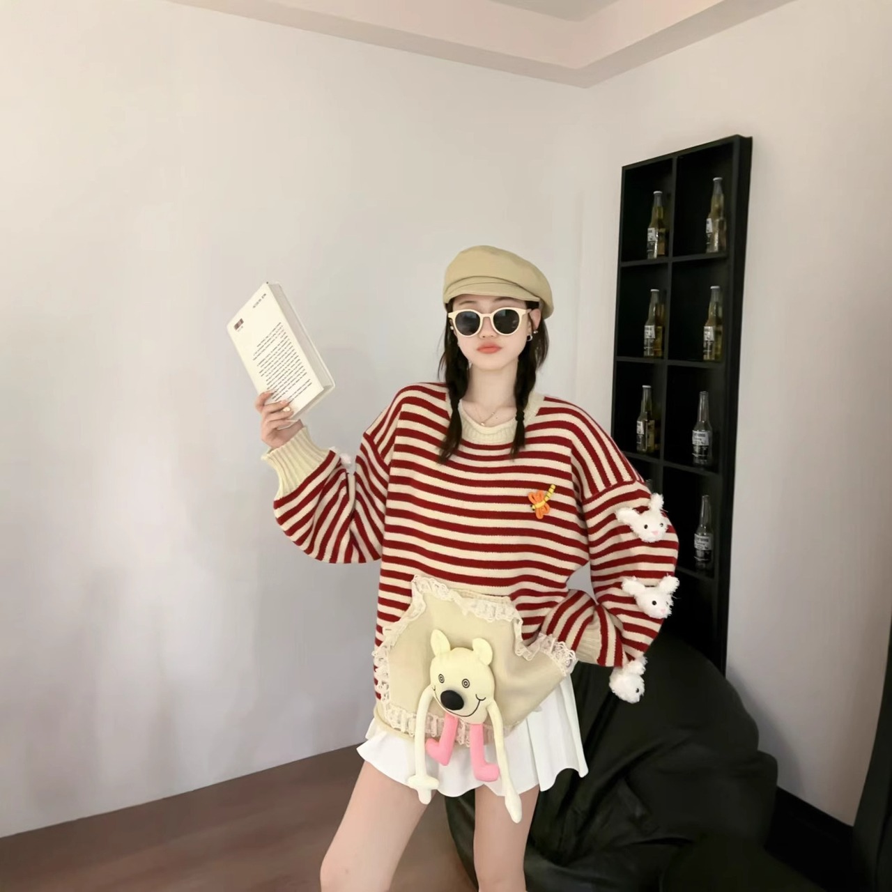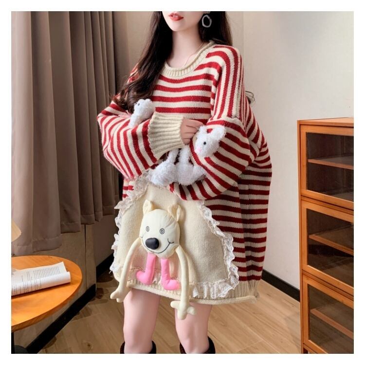 スタイルアップ効果抜群 個性的なデザイン ストライプ柄 2色選択ニットトップス<ins-10585>