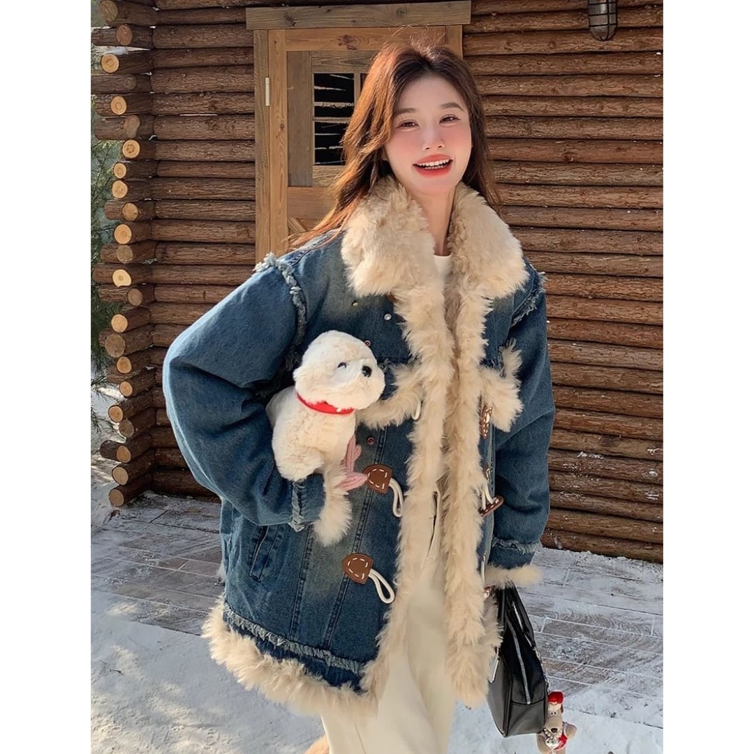 都市ファッショ オシャレデザイン デニム プラスベルベット ティングジャケット<ins-10301>